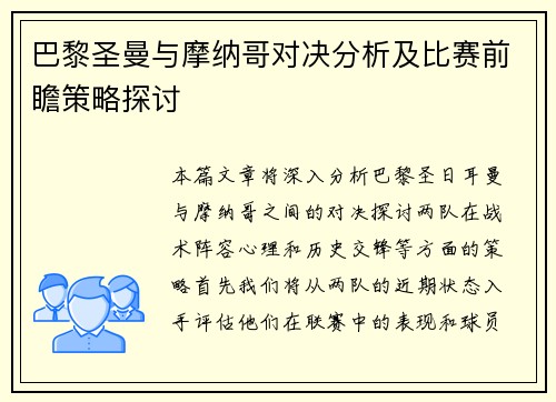 本文将围绕“塞尔维亚与黑山对决比分预测及最佳投注建议分析”进行深入探讨。首先,我们会分析两队的历史交锋记录和近期状态,为比分预测奠定基础。接着,将从战术风格、关键球员表现以及主客场因素三个方面进行分析,帮助读者更好地理解赛前形势,并提出相应的投注建议。最后,我们将总结这些分析带来的见解,以期为广大球迷和投资者提供有价值的信息和参考。希望通过我们的详细解析,能够使大家在观看比赛时更加投入,同时在投注...